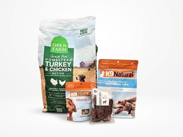 お待たせいたしました! 大型犬用のフードセットの登場です◎ プリスティーン(天然)なドッグフード「OPEN FARM」を使用したフードセットをご紹介いたします。 毎日の食事は、大切な愛犬の健康を保つために欠かせません。 このセットには最低限の栄養バランスが整ったドッグフードが含まれています。 毎日の食事計画も簡単に立てられます。 平飼いで育ったターキー・鶏肉を原料としたドッグフードと、フードの消化をたすけるグリーントライプ、タンパク質を補うベニソンレバー(肝臓)や野生鹿のラング(肺)で、愛犬の健康的な体作りをサポートします。 レバーは不足しがちなタウリンや、鉄分や亜鉛の補給にもなります。 ターキーや鶏肉は好き嫌いもあまりないため、与えやすいドッグフードになっています。 ご用意した商品は全てトレーサビリティがはっきりしている安心安全な食べ物です。 きっと今までのフードとの違いを感じていただけると信じています。 大切な家族である愛犬の健康を守るのは飼い主さまです。 ぜひ一度お試しください。 ◾️セット内容 OPEN FARMターキー&チキン(ベースフード) 4.98kg k9ナチュラル ラムグリーントライプ(補助食) 200g K9ナチュラル ベニソンレバー(補助食) 50g 野生鹿ラングジャーキー(補助食) 30g ◾️与え方 OPEN FARM(ターキー&チキン):給与量は裏面記載を参考にしてください k9ナチュラル ラムグリーントライプ:体重1kgに対して1cmくらいを目安に毎食与えてください K9ナチュラル ベニソンレバー:毎食少量トッピングとして与えてください 野生鹿ラングジャーキー:毎食少量トッピングとして与えてください 【どのくらいでなくなる?】 ◎15kgのコの場合 約27日 ◎20kgのコの場合 約20日 ◎25kgのコの場合 約16日 ◎30kgのコの場合 約14日 ※パピーの場合は既定の給与量より多く与えてください ※「成犬用」としてご用意していますが、パピーやシニアの子にも与えていただけます。 「パピー&老犬用」との違いは、セットのグリーントライプの種類の違いになります。 【グリーントライプの「ラム」と「ビーフ」の違い】 「お腹の健康」へのアプローチには、大きな違いはありませんが、それぞれのお肉の特長が反映されています。 ラム・グリーントライプは低脂肪・低コレステロール。香りが強く、嗜好性が高いので、食べムラのあるコや体重管理をしたいコなどにお勧めです。 ビーフ・グリーントライプは、消化がやさしく、抗炎症や、目や脳の健康に必要とされているオメガ3脂肪酸が豊富に含まれているので、パピーやシニア、内臓をいたわりたいコなどに、よりお勧めです。 ◾️原産国 OPEN FARM カナダ k9ナチュラル グリーントライプ ニュージーランド k9ナチュラル ベニソンレバー ニュージーランド 野生鹿ラングジャーキー 日本