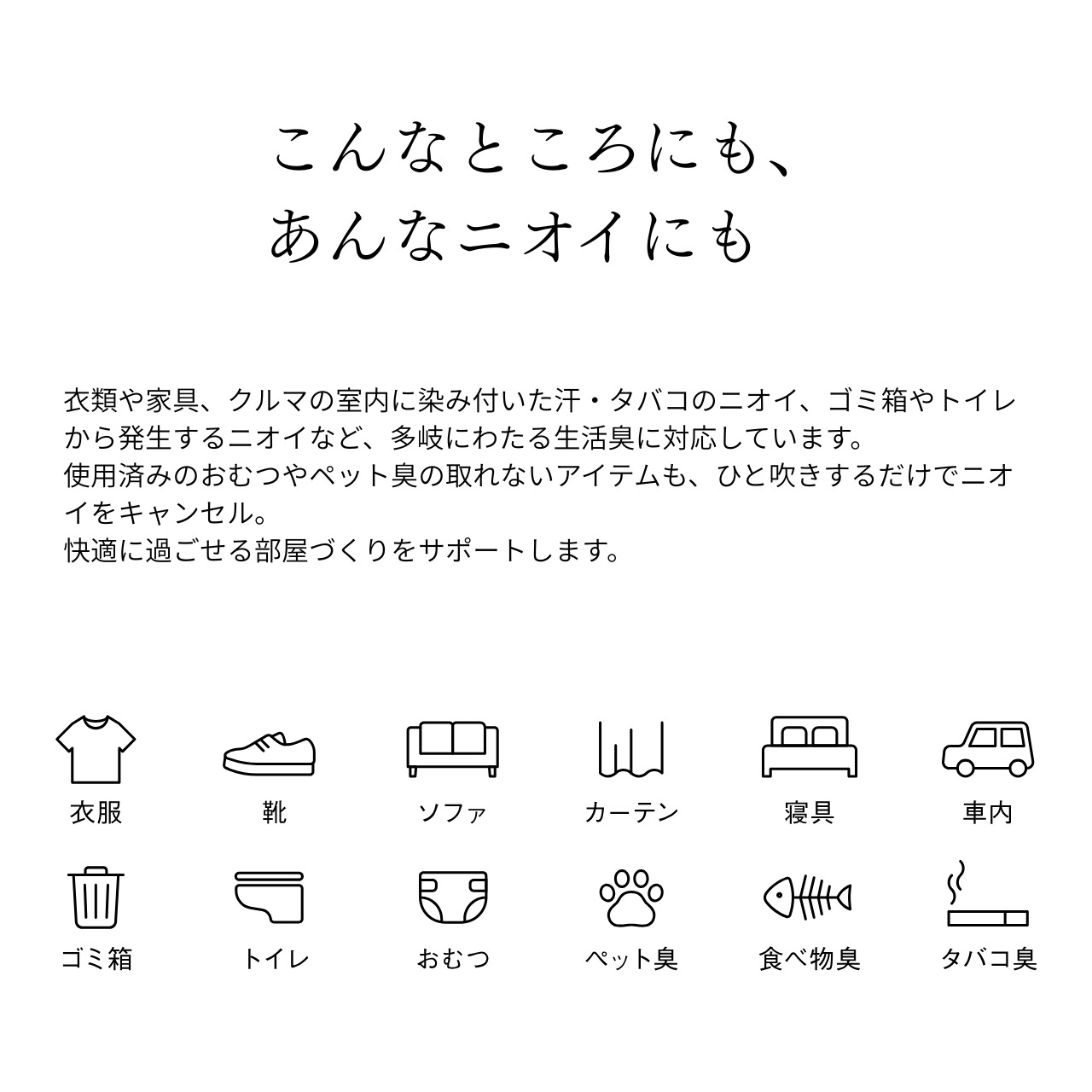 ニオイの発生源や空間に吹きかけるだけで、様々な生活臭を消臭・除菌します。