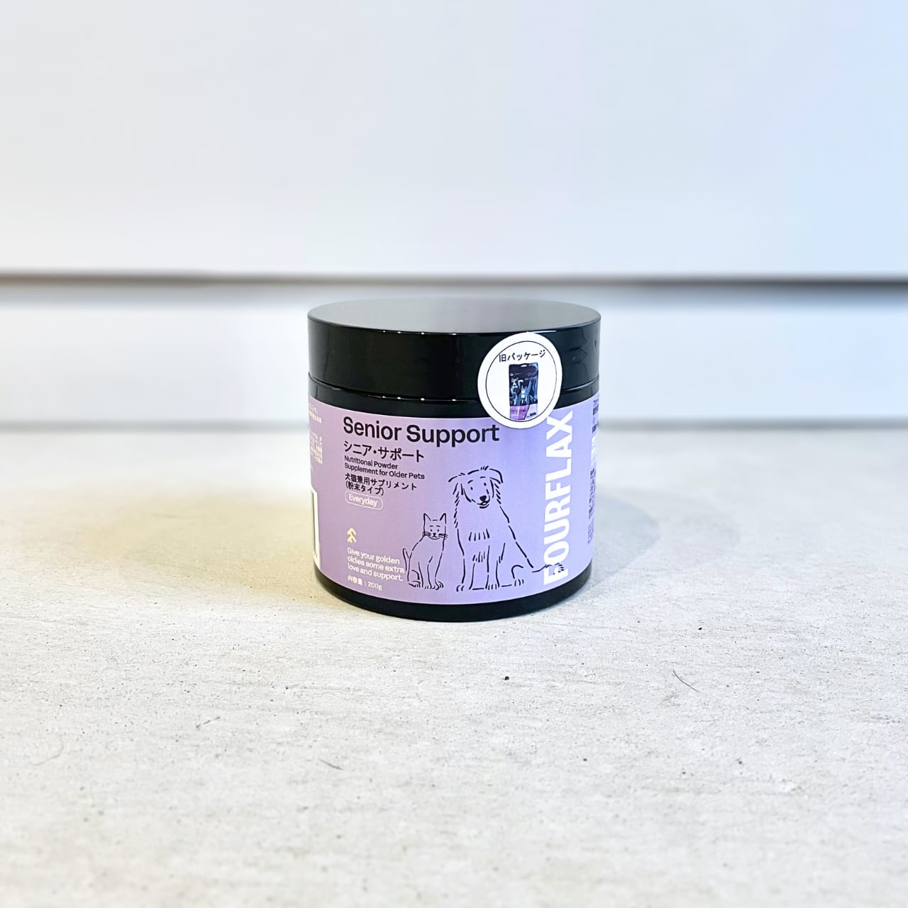 FOURFLAXシニア・サポートは、高齢の犬や猫の栄養サポートのために特別に作られた、毎日与えられるパウダータイプのサプリメントです。
